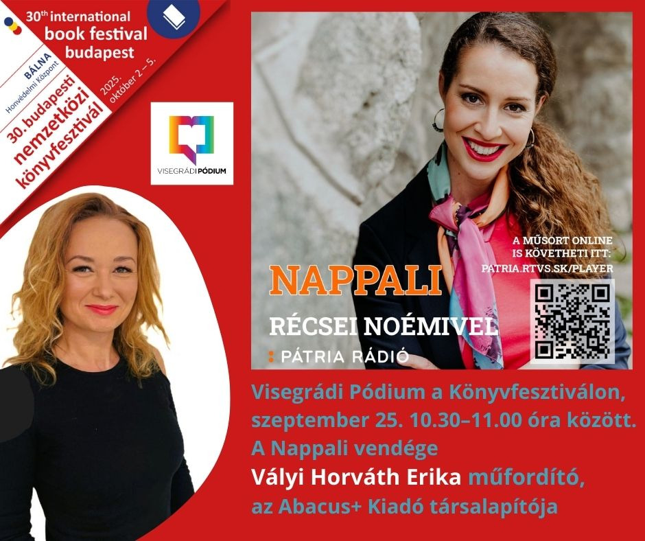 Vályi Horváth Erikával a 30. Budapesti Nemzetközi Könyvfesztivál Visegrádi Pódiumáról Récsei Noémi beszélget a Pátria Rádióban 2025. szeptember 25-én 10.30-tól. A beszélgetés élőben online is hallgatható: patria.rtvs.sk/player.